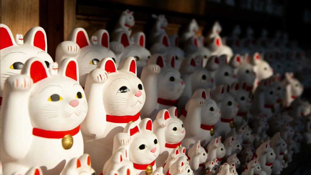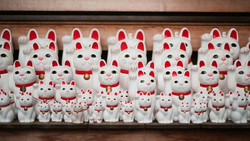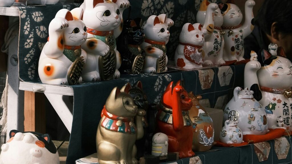 招き猫の文化は日本国内にとどまらず、現在では海外でも “Maneki-neko” として広く知られており、中華系のコミュニティやアジア系の飲食店など、世界各地で幸運を招くシンボルとして親しまれています。グローバルな縁起物として定着した招き猫は、まさに日本文化を代表するアイコンのひとつと言えるでしょう。